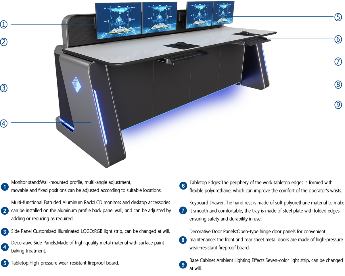 Personalized Customization Custom-built to your specifications. The console features rounded-edge design that exudes professionalism with approachability, while ensuring robust load-bearing capacity. Production Process Utilizing imported CNC machinery, the components undergo shearing, stamping, bending, and welding. The main frame is constructed from 2.0mm cold-rolled steel sheets, while other decorative parts use 1.2–1.5mm cold-rolled steel sheets. Surface Treatment: The steel sections undergo degreasing, acid pickling, anti-rust phosphating, and powder coating. Cable Routing Channel The console interior incorporates a dedicated cable routing channel to ensure segregation of power and data cables. Equipped with internal horizontal wireways, it enables effective cable management. The well-organized layout of lines within the console facilitates future maintenance and device management. Ergonomic Space Design Based on ergonomic principles, the console is customized according to the human kinematic envelope. Its floor-standing structure provides ample legroom, thereby enhancing the human-machine interaction experience.
